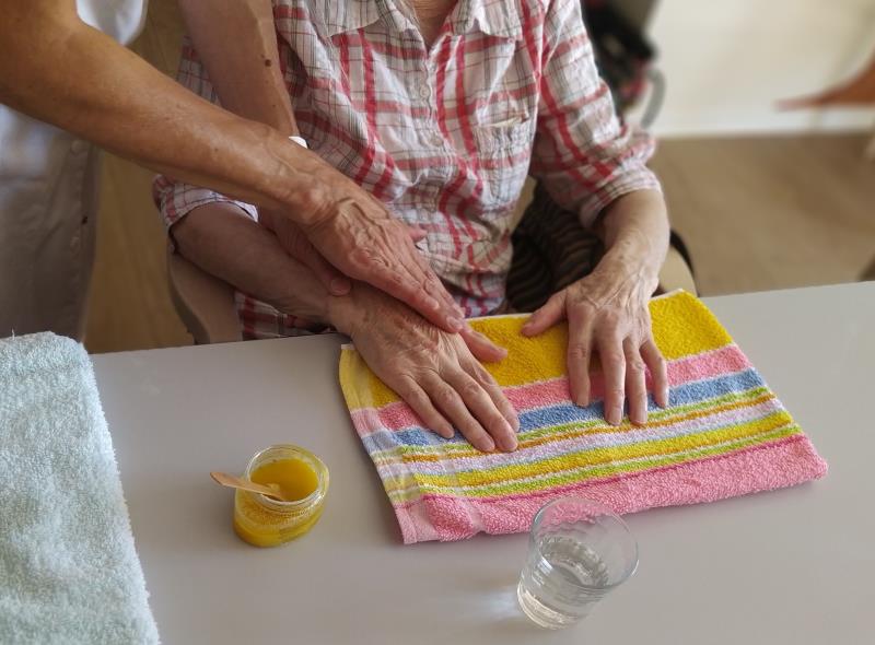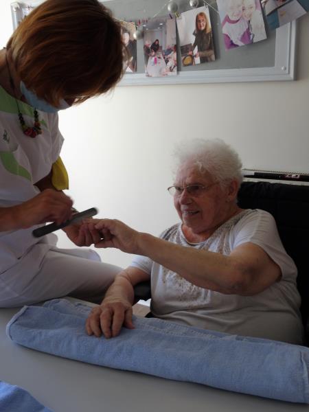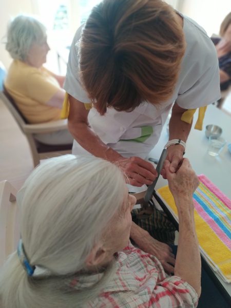 Mardi 7 juillet, dix résidentes ont profité du retour de Claudie, la socio-esthécienne avec u programme, soin des ongles, gommage et massage des mains sur un fond de musique douce, pour le plus grand plaisir des dames..