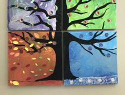 Pour fêter l'arrivée de l'automne, les résidents ont souhaité peindre les 4 saisons à leurs manières. Une fois de plus, ce tableau est exposé dans le hall d'accueil afin de faire profiter leur talent aux visiteurs des Jardins de Roinville.