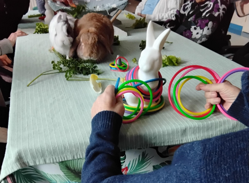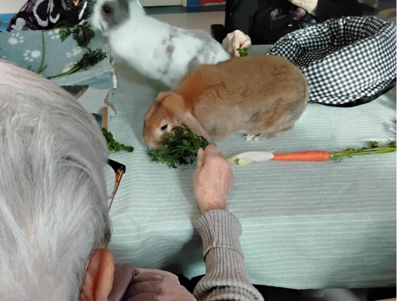La médiatrice animal intervient plusieurs fois par mois à la résidence avec des chiens, des cochons d'inde ou des lapins.