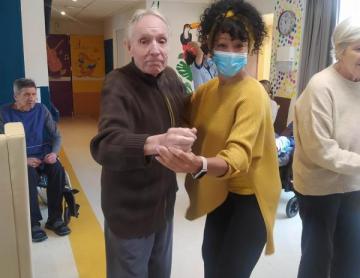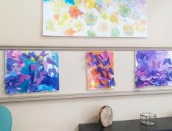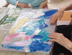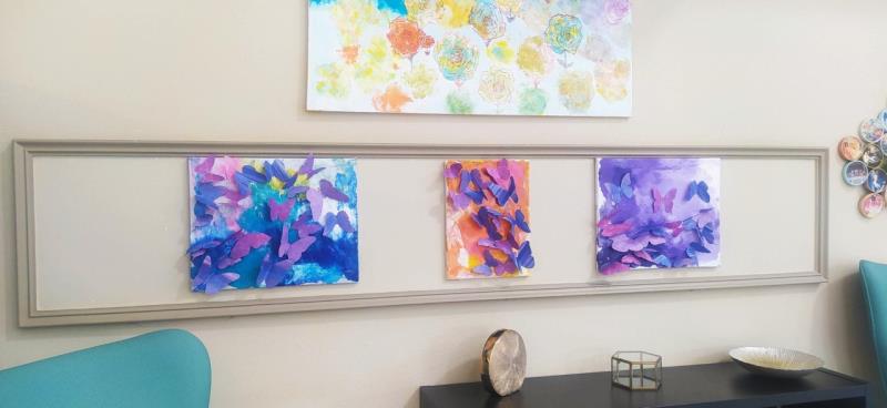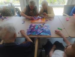 Les résidentes du secteur ouvert ont œuvré de leur coté en préparant des envolées de papillons violets, couleurs de notre thème du mois de Mai, pour les placer ensuite sur les toiles colorées, au gré de leur inspiration.