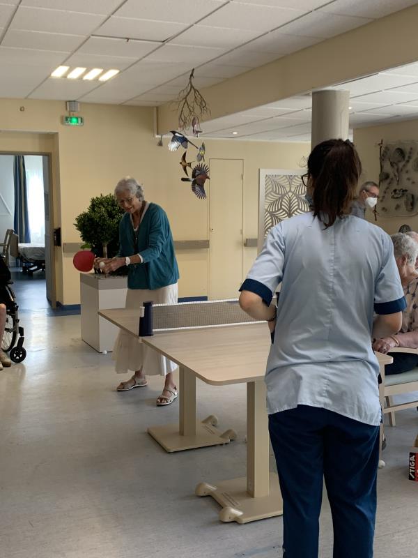 Ils ont pu échanger quelques balles entres résidents, mais aussi avec le personnel. Yvan, l'intervenant exterieur, leur a proposé des parties adaptées ( avec ou sans filet, avec ou sans rebond, assis sur des chaises ou debout).